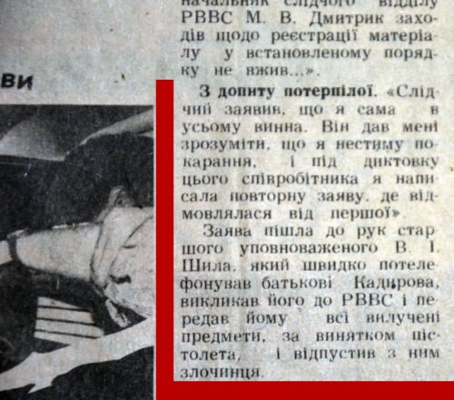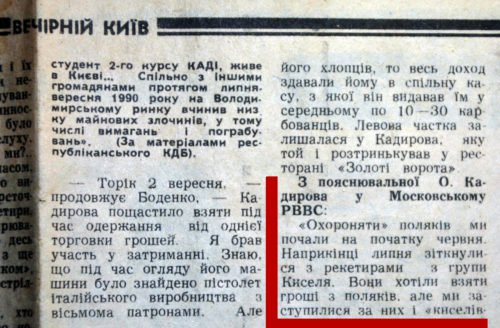 Именно в этом номере размещено расследование журналистки Людмилы Васильевой “Киевские дети “крестного отца”, которое практически полностью посвящено главе банды молодых отморозков, истязающих коммерсантов Владимирского рынка. Главой банды был наш герой – Сашка Кадыров. Вряд ли Васильева имела машину времени и знала, в кого вырастит 22-летний Кадыров-Онищенко. Точно также вряд ли журналистка имела какие-то корыстные мотивы, делая наезд на никому неизвестного юного паренька. Напротив, журналистка, а также депутат Московского райсовета (сейчас Голосеевский) Василий Боденко, помогавший ей в расследовании материала, подверглись психологическому воздействию после выхода статьи в газете.