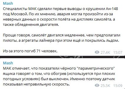 Как отмечается, причиной неправильной работы приборов могло стать обледенение датчиков. Неверные данные о скорости, как сообщили в МАК, могли стать причиной авиакатастрофы.