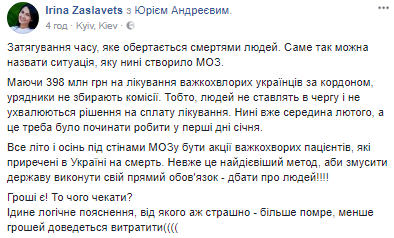"Все лето и осень под стенами МОЗ были акции тяжелобольных пациентов, обреченных в Украине на смерть. Неужели это самый действенный метод, чтобы заставить государство исполнить свою прямую обязанность - заботиться о людях!" - написала она на своей странице в Facebook.