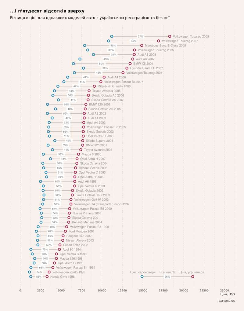 Сколько стоит зарегистрировать машину на украинские номера? Даже без спецпошлины, будущий владелец «легальной» машины тратится на заложенные в цену акцизный сбор, НДС, ввозную пошлину, сбор в Пенсионный фонд и транспортный налог (за новые авто). Итак, сколько получает государство с таких сделок? Мы нашли в данных информацию по цене для пар одинаковых марок машин (и одного возраста), одна из которых на «еврономерах», другая — с украинской регистрацией. На графике ниже вы можете увидеть разницу.