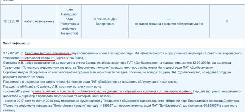 До прихода на «Донбассэнерго» Андрей Сергиенко много лет работал в ветроэнергетическом бизнесе. С 2012 г он является первым заместителем директора управляющей компании «Ветряные парки Украины», а в 2017-2018 г. он был директором ветряного парка «Благодатный». В нем же он числился совладельцем с долей 18,23%, но в ноябре прошлого года уступил ее Максиму Ефимову. Все становится еще интереснее с учетом того, что Ефимов является депутатом Верховной Рады от Блока Петра Порошенко. А Сергиенко официально числится его помощником и, предположительно, является доверенным лицом нардепа.