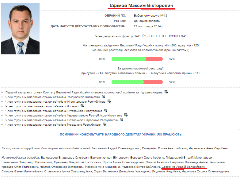 Ефимова можно считать своеобразным бизнес-коммуникатором между представителями нынешней и прошлой власти, и судя по всему, именно этим объясняются произошедшие в «Донбассэнерго» перестановки. До вхождения в состав фракции БПП Ефимов был депутатом Краматорского горсовета от Партии регионов, а его карьера была неразрывно связана с Сергеем Близнюком — сыном одного из старейшин Партии регионов, бывшего главы Донецкого областного совета и экс-министра ЖКХ Анатолия Близнюка. Считается, что именно Близнюк дал Ефимову путевку в жизнь, сделав сначала коммерческим, а затем и генеральным директором подконтрольного ему завода «Энергомашспецсталь» с долей в этом и других бизнесах. Но после смены власти ученик превзошел учителя — в 2014 году они схлестнулись как самовыдвиженцы на одном округе в Краматорске, в итоге Близнюк набрал всего 4,5% голосов, а Ефимов — 34%, став нардепом. Правда, несмотря на это, они до сих пор формально остаются бизнес-партнерами — например, вместе с невесткой Анатолия Близнюка Еленой Ефимов владеет компанией «Гольф Вижн Украина». Помимо этого, Ефимов остается своим человеком и в «Энергомашспецстали», которая с 2010 года контролируется Кремлем через Росатом, регулярно отчитываясь о получении сотен тысяч гривен доходов от этого предприятия. А на сайте «Энергомашспецстали» он до сих пор указан как президент этого предприятия.