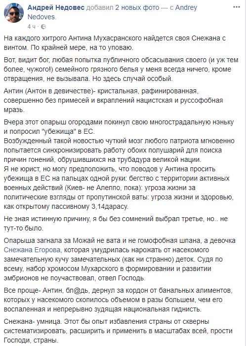 Наталья Стельмах пишет, что скандал с Мухарским - показатель эрозии семейных ценностей в Украине: "Чуваку (не поворачивается язык назвать мужчиной) не разрешают видеться с детьми - он поэтому бежит от них ещё дальше в Европу. У него не хватает $3,000 платить алименты - но денег жить в Европе хватит... И во всем он обвиняет Украину... При этом Егорову (к-я осталась с 5-ю детьми в Украине) мужчины в комментариях сплошь называют стервой и с...й.... Мрак..."