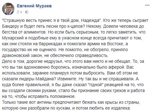 ""Страшную весть принес я в твой дом, Надежда". Кто же теперь сыграет Бандеру и будет петь песни про к-цапов? Некому. Довели человека до бегства от алиментов. Но если быть серьезным, то легко заметить, что Мухарский и подобные ему в ужасном конце всегда причитают о том, как они стояли на баррикадах и помогали армии на Востоке, а государство их не оценило. Не помогло, не обогрело, приняло драконовский закон, не обеспечило справедливость.