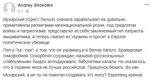 Блогер Андрей Шокотко говорит, что шоумен сам приложил руку к нынешней ситуации в стране: "Мухарский (Орест Лютый) сначала зарабатывал на довольно примитивном разжигании межнациональной розни, под предлогом войны и патриотизма, представлял из себя законченный тип патриота-вышиватника, а теперь свалил из Украины и просит в Европе политическое убежище.