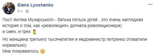Блогер Елена Лешенко: "Пост Антіна Мухарського - батька пятьох дітей...это очень наглядная история о том, как "революция" догнала революционера) и смех, и грех".