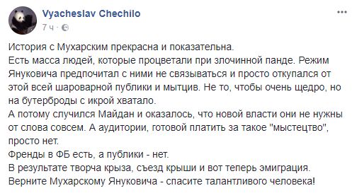 Журналист Вячеслав Чечило: "История с Мухарским прекрасна и показательна. Есть масса людей, которые процветали при злочинной панде. Режим Януковича предпочитал с ними не связываться и просто откупался от этой всей шароварной публики и мытцив. Не то, чтобы очень щедро, но на бутерброды с икрой хватало.
