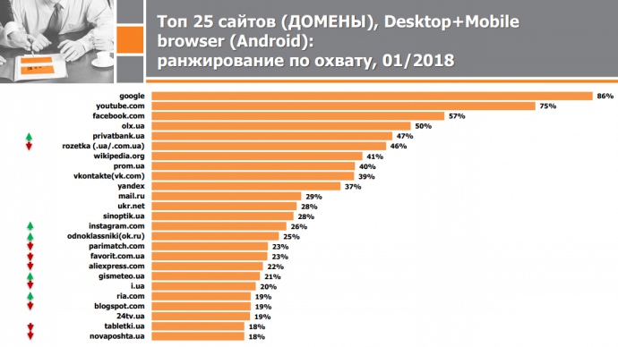 Сразу три российских сайта - Вконтакте, Одноклассники и Яндекс - попали в рейтинг самых популярных вебсайтов, которыми пользуются украинцы, по средней дневной аудитории.