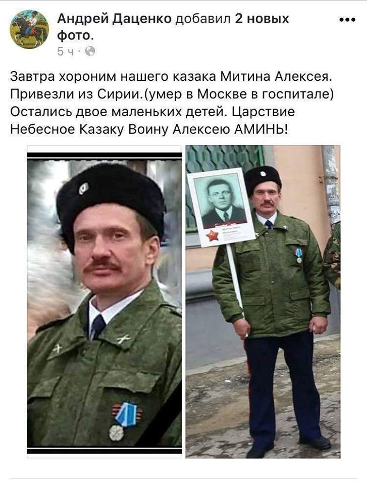 Отмечается, что он умер в московском госпитале. У Митина осталось двое детей. Помимо членства в "ЧВК Вагнера" он также был представителем некого "казачества". Похороны террориста состоятся 18 февраля.