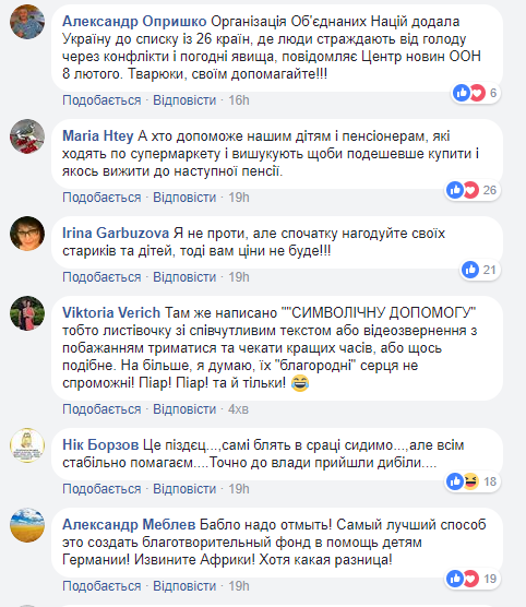 «Там же написано “символическую помощь” то есть открыточку с сочувственным текстом или видеообращение с пожеланием держаться и ждать лучших времен, или что-то подобное. На большее, я думаю, их “благородные” сердца не способны! Пиар! Пиар! и только!», «У нас тысячи пенсионеров голодают и не могут справиться, а они помогут Африке, это будет так: за наш счет купят гуманитарки на 100 грн, отправят на 10 грн, спишут 110 грн и эту же гуманитарку продадут нашим пенсионерам, суки», «Твари, своим помогайте», «Это пиздец…, сами бля*ь в жопе сидим…, но всем стабильно помогаем… Точно к власти пришли дебили….», – отмечают украинцы.