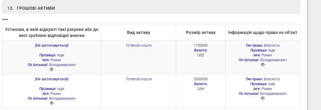 Действительно, сам Инде только наличными хранит 1,15 млн долларов и 2 млн гривен! Доход Романа Инде от сдачи в аренду недвижимости в 2016 году составил 482 тыс. гривен.