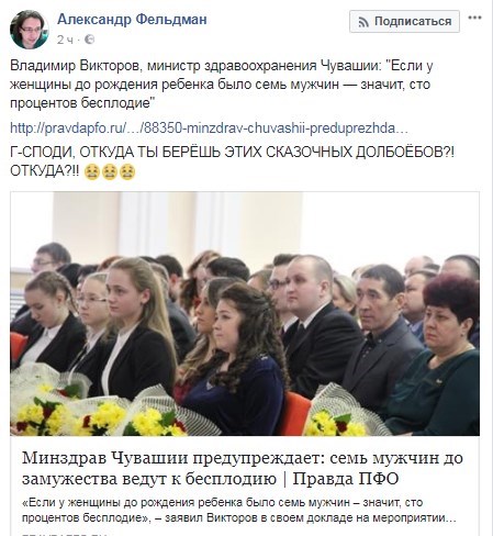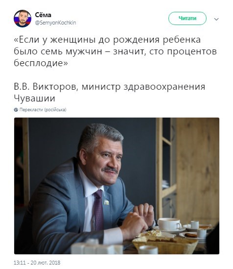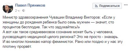 Министр здравоохранения Чувашии Владимир Викторов в ходе заседания в здании местной администрации предрек бесплодие всем женщинам, у которых до рождения ребенка было семь мужчин.