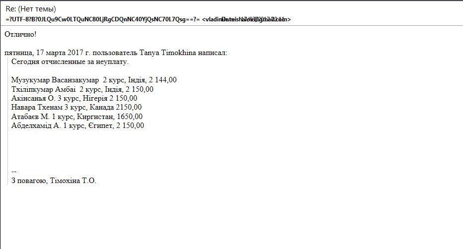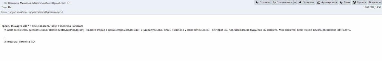 Далее цитата: «У меня также есть русскоязычный Шатнави Шади (Иордания) – на него Фарид с Цихмистером подписали индивидуальный план. Я сказала у меня начальники – ректор и Вы (прим. Мишалов), подписывать не буду. Как Вы скажете. Мне кажется, всем нужно делать одинаково – отчислять. З повагою, Тімохіна Т.О.» (орфография и пунктуация автора сохранены).