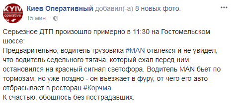 "Водитель MAN бьет по тормозам, но уже поздно - он въезжает в фуру, от чего его авто отбрасывает в ресторан "Корчма", - говорится в сообщении.