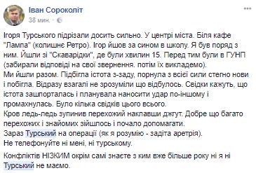 Коллега Турского, экс-депутат Иван Сороколит, сообщает, что “Игоря Турского подрезали довольно сильно. В центре города. Возле кафе “Лампа” (бывшее Ретро). Игорь шел за сыном в школу. Я был рядом с ним. Шли со “Скаварідки”, где были минут 15. Перед тем были в ГУНП (забирали ответы на свои обращения. потом их выложим).