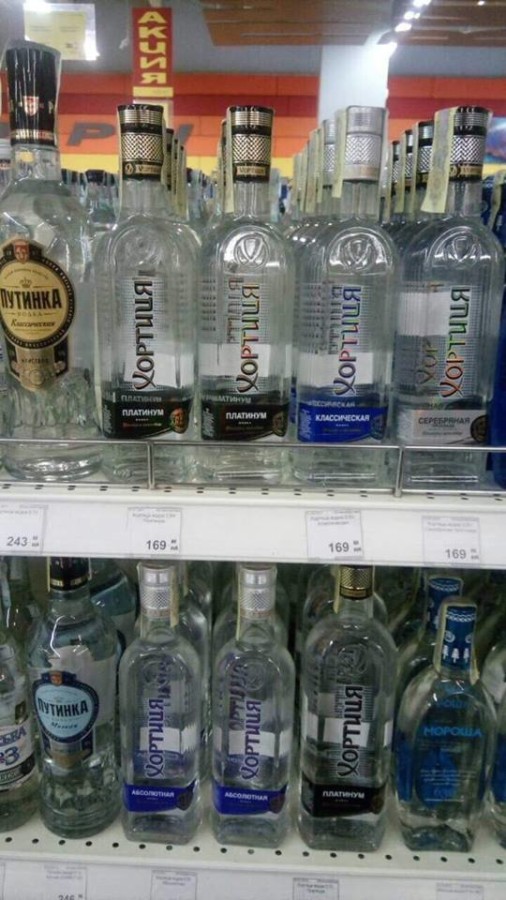 Как сообщают активисты, по понятным причинам вынужденные сохранять анонимность, продукция ТМ "Хортица", "Мороша" представлены на прилавках торговых центров "ДНР" с поздравлениями в адрес "мужчин ДНР" с 23 февраля от имени торговой марки и ее владельца. При этом продукция "Хортицы" соседствует с водочными брендами производства РФ, в том числе - ТМ "Путинка".