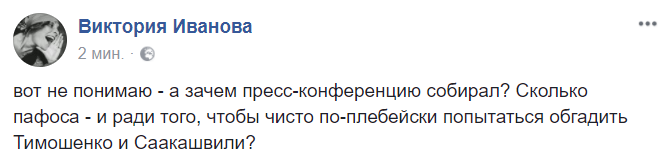 "Вот не понимаю - а зачем пресс-конференцию собирал? Сколько пафоса - и ради того, чтобы чисто по-плебейски попытаться обгадить Тимошенко и Саакашвили?", - удивляется блогер Виктория Иванова.