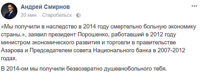 ""Мы получили в наследство в 2014 году смертельно больную экономику страны", - заявил президент Порошенко, работавший в 2012 году министром экономического развития и торговли в правительстве Азарова и Председателем совета Национального банка в 2007-2012 годах.