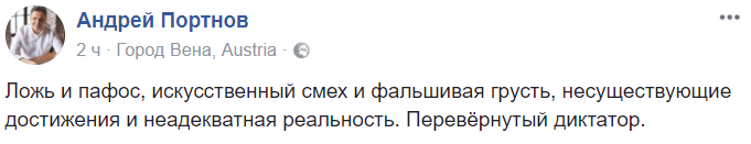"Ложь и пафос, искусственный смех и фальшивая грусть, несуществующие достижения и неадекватная реальность. Перевёрнутый диктатор", - кратко написал юрист Андрей Портнов.