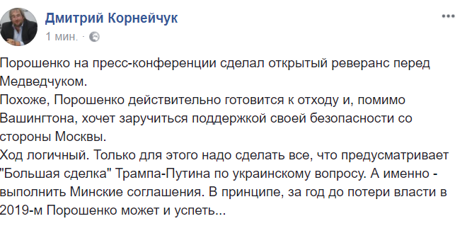 Ход логичный. Только для этого надо сделать все, что предусматривает "Большая сделка" Трампа-Путина по украинскому вопросу. А именно - выполнить Минские соглашения. В принципе, за год до потери власти в 2019-м Порошенко может и успеть..."
