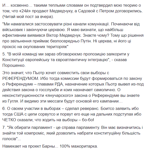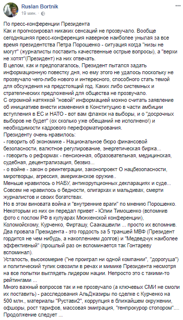 "Много важных вопросов так и не прозвучало (а ключевые СМИ не смогли их поставить) - расследования Аль-Джазиры по сделке с Курченко на 500 млн., материалы "Рустави2", коррупция в ближайшем окружении, офшоры, рост тарифов, массовая эмиграция, "генпрокурор с топором"".