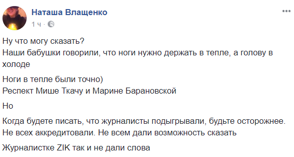 Среди лучших продюсер Наталья Влащенко отметила вопрос журналистки Марины Барановской.