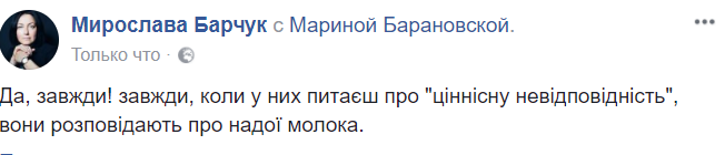 "Как так получается, что в стране все плохо, а у вас все хорошо? Это не мой вопрос, его когда-то задал Mustafa Nayyem экс-президенту Виктору Януковичу. Так скажите пожалуйста, как быть президентом олигархом в стране, где люди близки к гуманитарной катастрофе? Не чувствуете ли вы свое ценностное несоответствие этой должности?", - спросила Барановская.