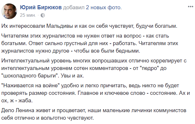 В свою очередь советник Порошенко Юрий Бирюков раскритиковал журналистов за вопросы о Мальдивах и состоянии президента, назвав представителей СМИ "личинками коммунистов".