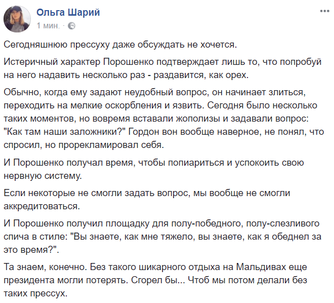 Журналистка Ольга Шарий делится впечатлениями от пресс-конференции: