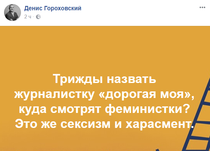 "Трижды назвать журналистку "дорогая моя", куда смотрят феминистки? Это же сексизм и харасмент", - пишет Гороховский, имея в виду беседу Порошенко с Барановской, задавшей вопрос о том, почему президент так хорошо живет.