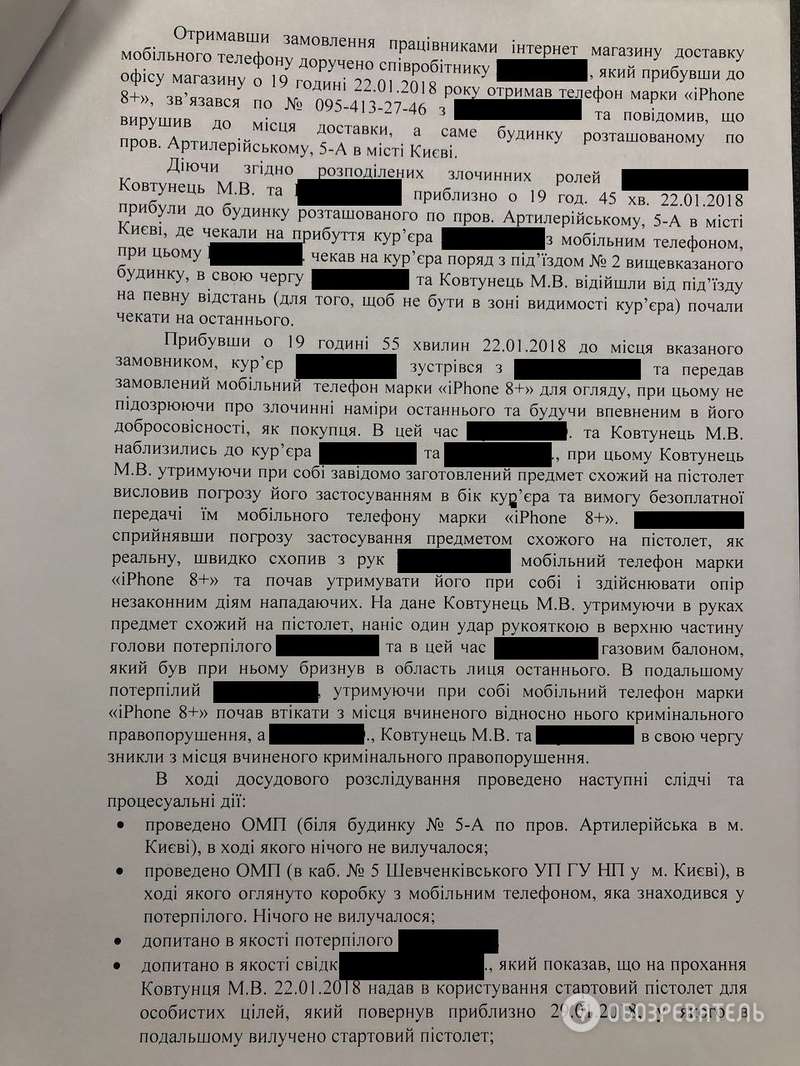 В ходе опознания курьер узнал в Ковтунце того, кто угрожал ему пистолетом. Участникам нападения вручили подозрения о совершении преступления.