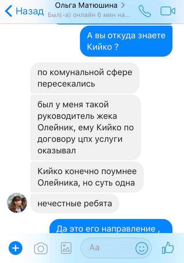 Роман Шестопалов запитує в Матюшиної: «А ви звідки знаєте Кийко?». До слова, Кийко є пов’язаною з Колесніковим людиною. Тут Матюшина зізнається, що пересікалася з ним по «комунальній сфері»: «Був у мене такий керівник жеку Олійник, йому Кийко по угоді цпх послуги надавав. Кийко звісно розумніший від Олійника, втім суть однакова. Нечесні хлопці. Кийко професійний злодій. А Колесніков саме таких і садить на потоки».