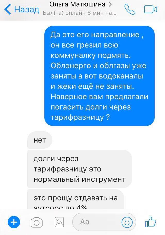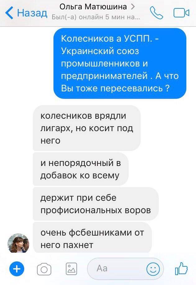 Юрист Роман Шестопалов у переписці з Ольгою Матюшиною зізнається, що раніше він працював на віце-президента УСПП Віталія Колеснікова, який за часів Януковича та Партії регіонів організовував передачу житлово-комунальних об’єктів у концесію. Шестопалов розповідає Матюшиній, що за афери у сфері ЖКГ Віталій Колесніков певний час навіть був у СІЗО, їздив у Москву та зараз «тре» з громадянином Кийко.
