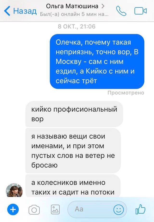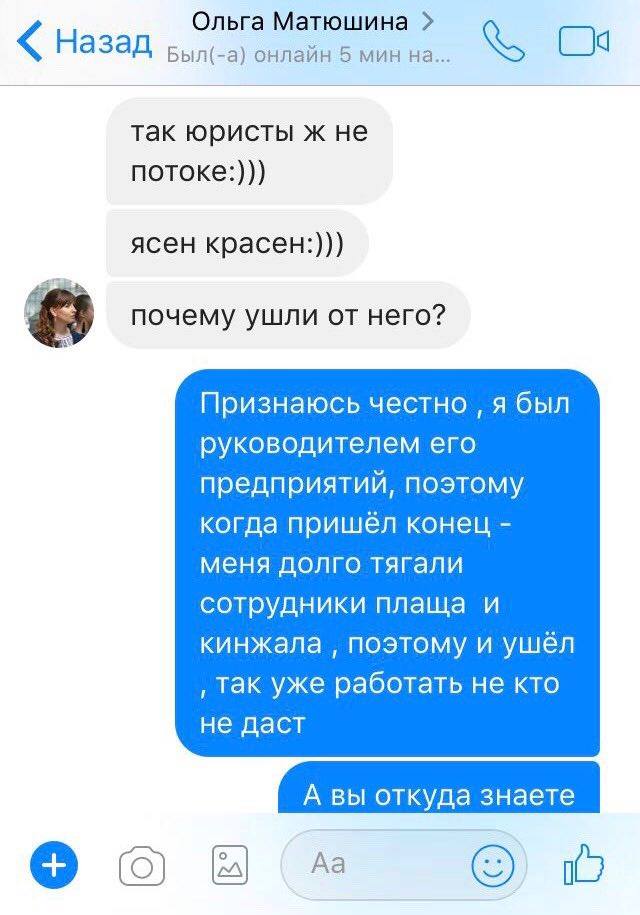 Матюшина у переписці підтверджує, що пересікалася з Колесніковим, проте демонструє потужну обізнаність у «воровському» світі та підозрює Колеснікова у зв’язках з ФСБ: «Колесніков навряд чи олігарх, але косить під нього. І непорядний на додачу до всього. Тримає при собі професійних злодіїв. Надто фсбешниками від нього пахне».