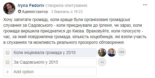 Треба сказати, що це були реально дуже якісно організовані громадські слухання. І вони чітко показують, що в 2015 році, коли влада Коцюбинського насильно приєднала нас до Ірпеня, думку громади підло сфальшували.