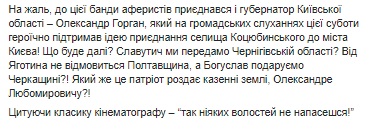 "Як депутат Київради від Біличів розумію, що Коцюбинське де-факто вже частина Києва. Сьогодні був свідком дійсно історичної події – громадських слухань з приводу приєднання Коцюбинського до Києва. Питання було єдине – чи підтримує громада приєднання до столиці. Мешканці селища дуже активні і це приємно бачити. Якщо більшість коцюбинців висловиться за приєднання, то наступним кроком буде рішення Київради", каже "свободівець" Антон Прохор.