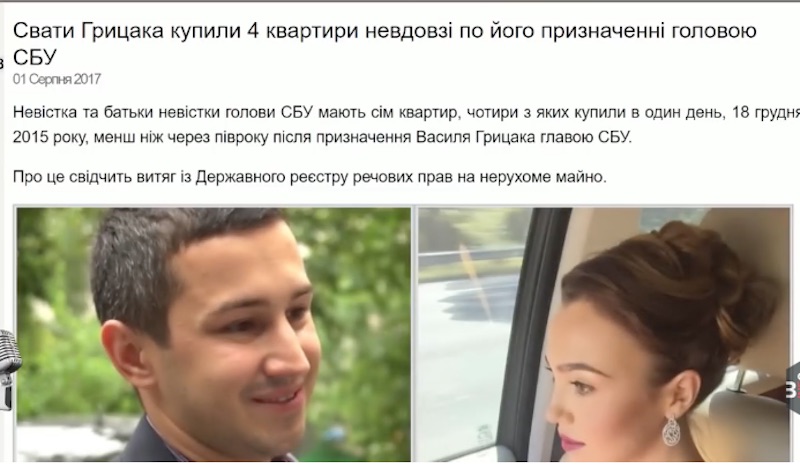 Таким образом журналисты выяснили, что у родственников руководителя СБУ Василия Грицака, его невестки и ее родителей, есть 7 квартир, 4 из которых куплены в один день, и менее чем через 4 года после назначения Грицака руководителем СБУ. Доступа к декларациям еще 600 сотрудников Службы безопасности нет.