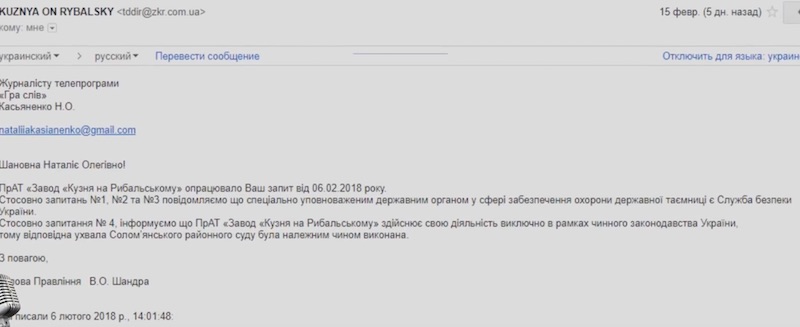СБУ ищет разглашение гостайны в судебных решениях, которые касаются президентского бизнеса. Служба безопасности вступилась за совместный бизнес Петра Порошенко и нардепа Игоря Кононенко — завод «Кузня на Рыбальском». СБУ открыла целое уголовное производство по заявлению главы правления завода «Кузня на Рыбальском» Валерия Шандры. На запрос журналистов он ответил: