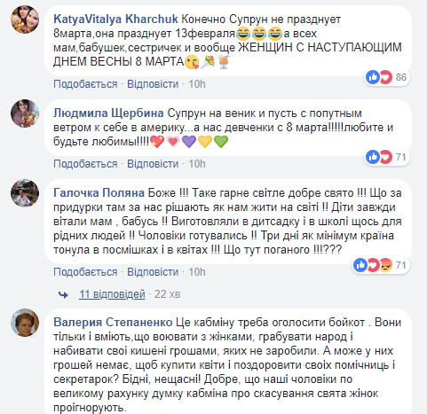 «Боже!!! Такой хороший светлый добрый праздник!!! Что за придурки там нас решают, как нам жить в мире!! Дети всегда поздравляли мам, бабушек!! Изготавливали в детском саду и в школе что-то для родных людей!! Мужчины готовились!! Три дня как минимум страна тонула в улыбках и в цветах!!! Что здесь плохого!!!???», «Я смотрю, теперь у нас Супрун всем заправляет. Мало того, что скорые отменила, теперь за праздники берется. Кто она такая вообще, чтобы всем навязывать свое мнение», «Ниче, своим женщинам подарят весьма ценные подарки и поздравят, а вы типа не празднуйте, ничего не дарите, упадите на пол и плачьте. Надоели эти политики со своим маразмом», «Так она и не женщина, разумеется, не празднует», «Тоже мне авторитет», «Это Кабмина надо объявить бойкот», – говорится в комментариях.