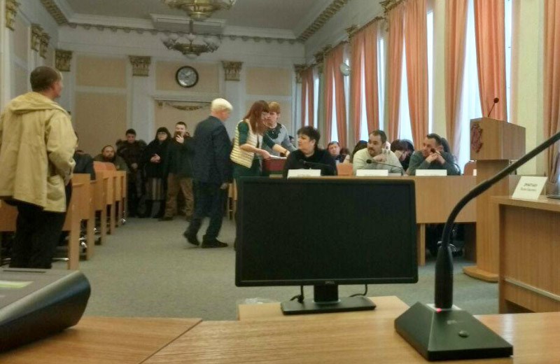В городском совете Полтавы произошли столкновения между активистами и чиновниками, из-за чего заседание исполкома перенесли на неопределенное время.
