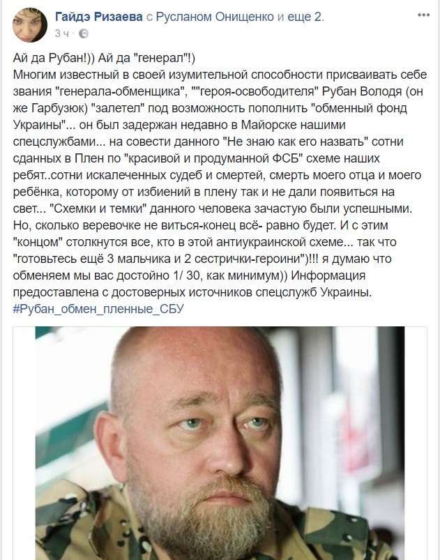 Они передали редакции фотографию Рубана, на руках которого надеты наручники. По их сведениям, руководителя "Офицерского корпуса" "взяли" на линии разграничения с т.н. "ДНР" - пункте пропуска в поселке Зайцево Донецкой области.