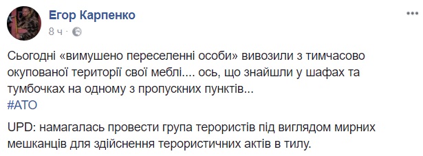 "Сегодня вынужденные переселенцы вывозили с временно оккупированной территории свою мебель... Вот что нашли в шкафах и тумбочках на одном из пропускных пунктов", - отмечает он.