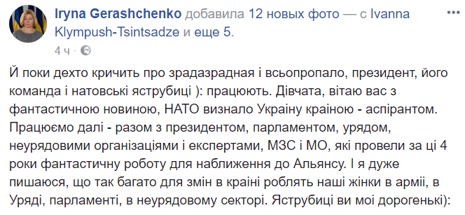 "И пока некоторые кричит о "зрадазрадная" и "всепропало", президент, его команда и натовские ястребки работают. Девушки, поздравляю вас с фантастической новостью: НАТО признало Украину страной - аспирантом", - вторит ему вице-спикер.