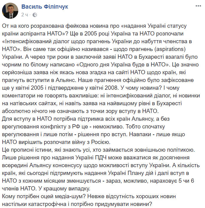 Экс-директор департамента евроинтеграции Кабмина, дипломат и политолог Василий Филипчук вообще назвал новость об "аспирантуре" в НАТО "фейковой":