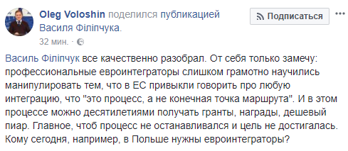 «От себя только замечу: профессиональные евроинтеграторы слишком грамотно научились манипулировать тем, что в ЕС привыкли говорить про любую интеграцию, что «это процесс, а не конечная точка маршрута». И в этом процессе можно десятилетиями получать гранты, награды, дешевый пиар. Главное, чтоб процесс не останавливался и цель не достигалась. Кому сегодня, например, в Польше нужны евроинтеграторы?», — написал Волошин.