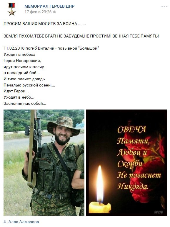 Об этом сообщил блогер Necro Mancer в соцсети Twitter, отметив, что Колесников с позывным "Большой" погиб 11 февраля, тогда как другой боевик с позывным "Гомер" был ликвидирован 18 декабря минувшего года.