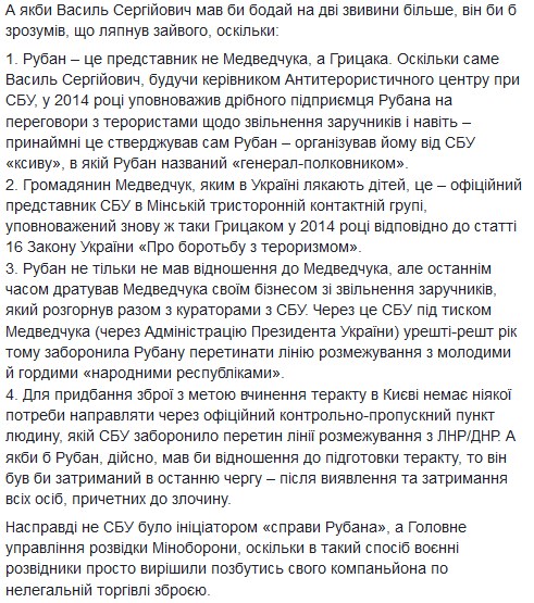 4. Для приобретения оружия с целью совершения теракта в Киеве нет никакой необходимости направлять через официальный контрольно-пропускной пункт человека, которому СБУ запретило пересечение линии разграничения с ЛНР / ДНР. А если бы Рубан действительно имел отношение к подготовке теракта, то он был бы задержан в последнюю очередь - после выявления и задержания всех лиц, причастных к преступлению."