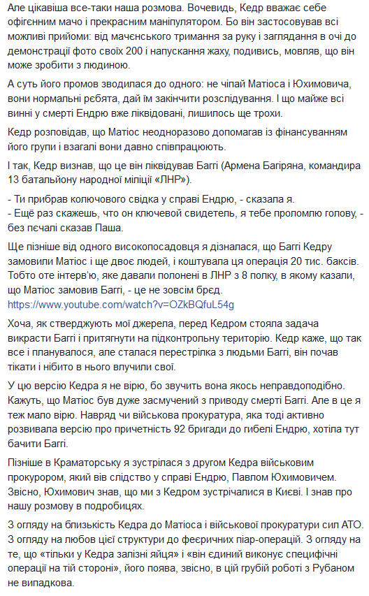Еще позже от одного высокопоставленного лица я узнала, что Багги Кедру заказали Матиос и еще два человека, и стоила эта операция 20 тыс. долларов. То есть то интервью, которое давали пленные в ЛНР с 8 полка, в котором говорили, что Матиос заказал Багги - это не совсем бред.