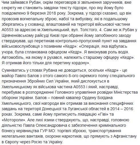 "Чем занимался Рубан, кроме переговоров по освобождению заложников, уже секрета не представляет благодаря тексту подозрения, которое ему было предъявлено 9 марта 2018 года. В частности, сказано, что он провозил огнестрельное оружие, патроны и взрывчатку, которые в дальнейшем хранились в тайнике, устроенном на территории военной части А0553 по адресу г. Хмельницкий, ул. Толстого, 4. Сам же Рубан в Щевченковском райсуде Киева при избрании ему меры пресечения утверждал, что пересекал контрольно-пропускной пункт по заданию военнослужащего с позывным "Кедр": "Операция, которая состоялась вчера, была спланирована офицером "Кедр". Я выполнял роль водителя. Автомобиль, на котором я передвигался, принадлежит старшему офицеру "Кедр". Я получил его только для пересечения границы".