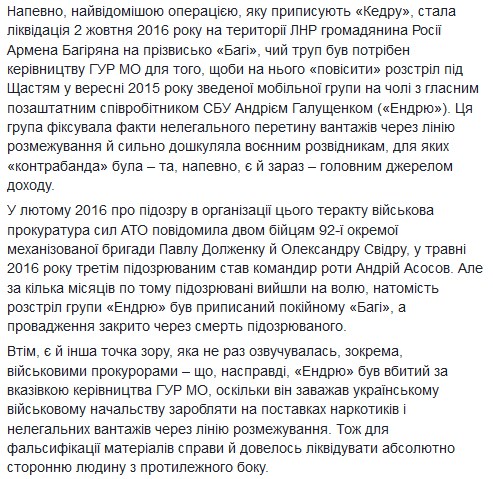 Наверное, самой известной операцией, которую приписывают "Кедру", стала ликвидация 2 октября 2016 года на территории ЛНР гражданина России Армена Багирян по прозвищу "Баги", чей труп был нужен руководству ГУР МО для того, чтобы на него "повесить" расстрел под Счастьем в сентябре 2015 года сводной мобильной группы во главе с внештатным сотрудником СБУ Андреем Галущенко ("Эндрю"). Эта группа фиксировала факты нелегального пересечения грузов через линию разграничения и сильно донимала военным разведчикам, для которых "контрабанда" была - и, наверное, есть и сейчас - главным источником дохода.